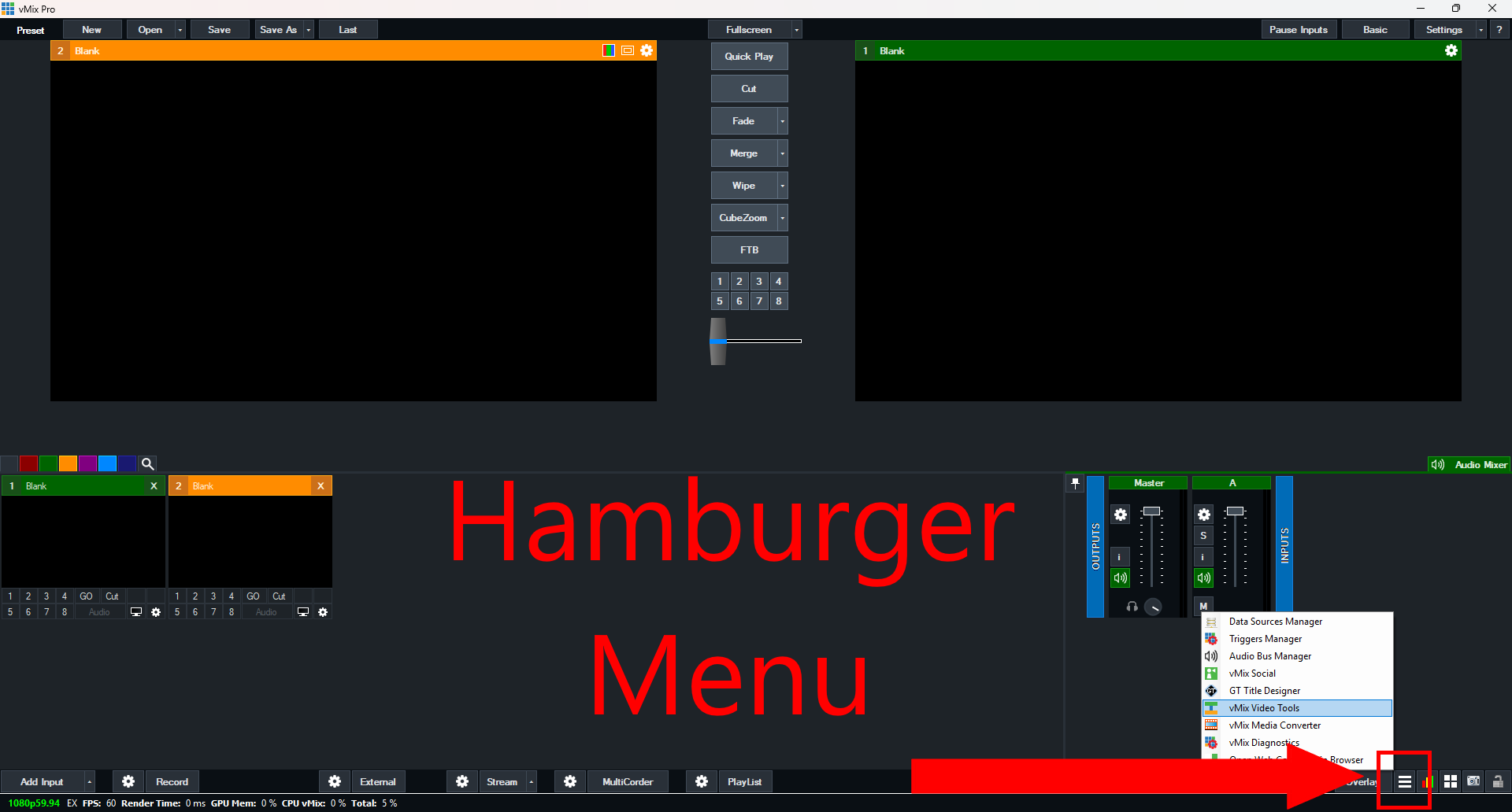 The Hamburger Menu can be found in the bottom right-hand corner of the vMix interface and contains some easy access to various vMix functions. Some of these include the vMix Title Designers, vMix Video Tools and the Data Sources Manager.